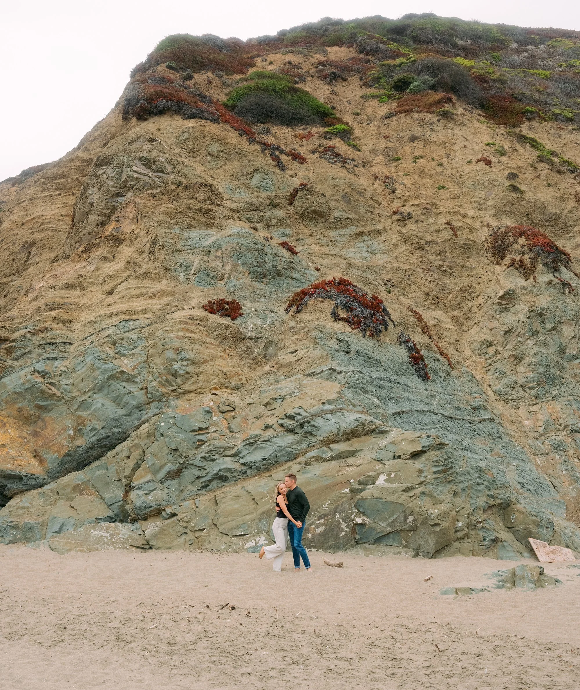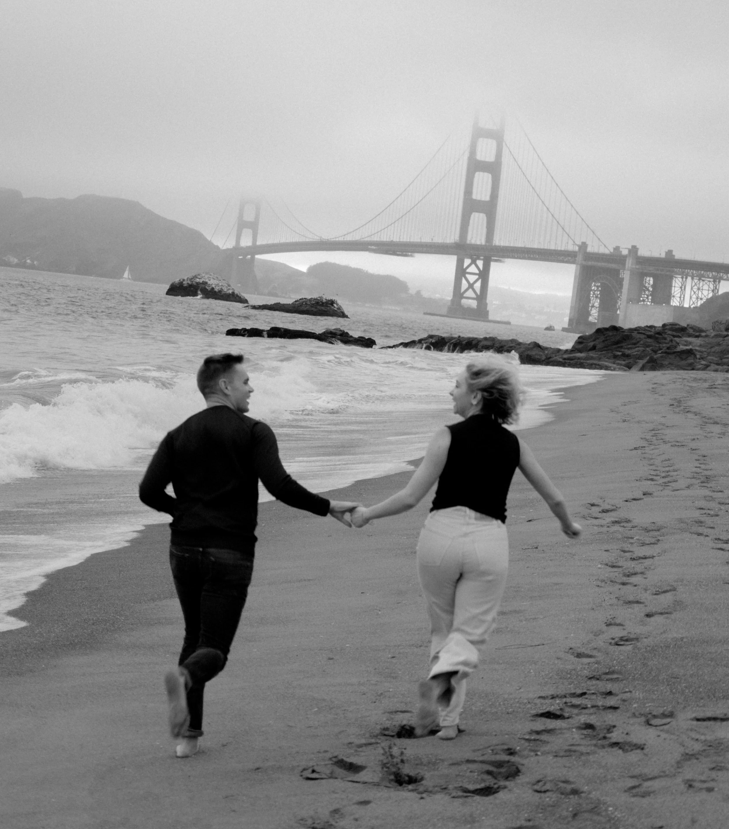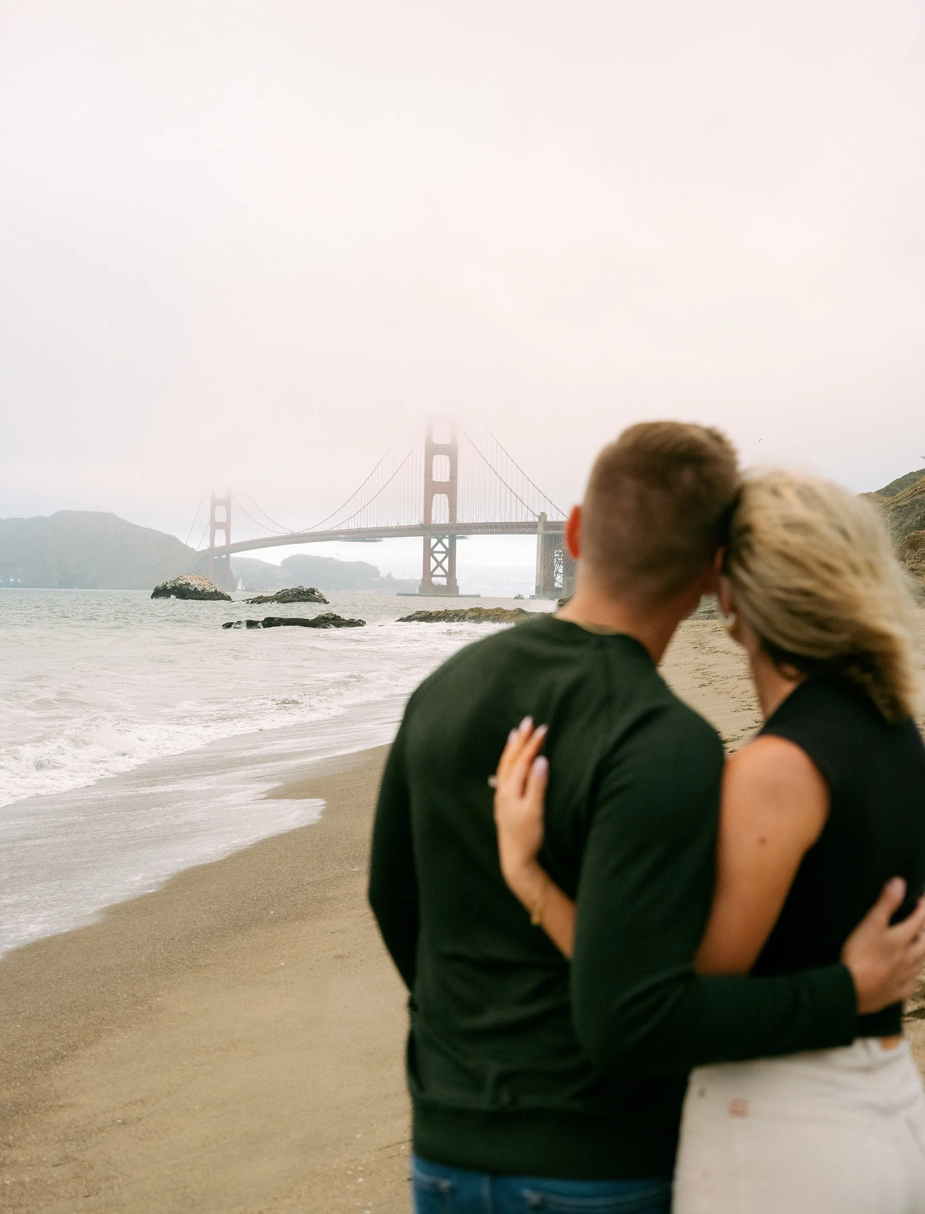 I typically take my clients to the north end of the beach, where the Golden Gate feels closer, and rugged rock formations add depth to the shots. An afternoon or evening session is ideal for capturing soft, diffused light. While warmer days and weekends can draw large crowds looking to cool off, I’ve never had trouble finding a quiet section for a session. So, it’s usually safe to stick with whatever date works best for you!